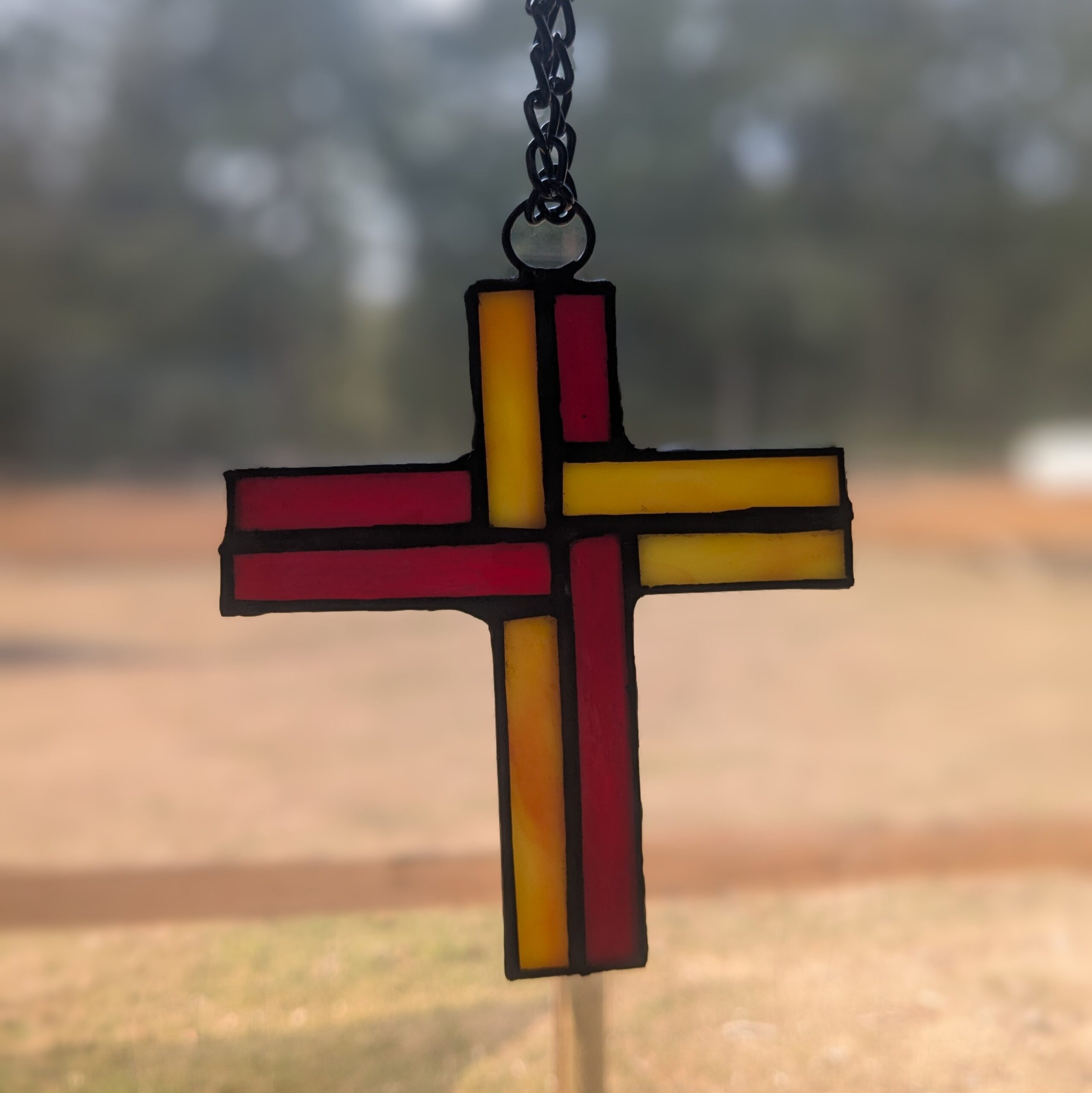 Dual tone cross made with lead solder. Includes 8 in chain and suction cup window mount.